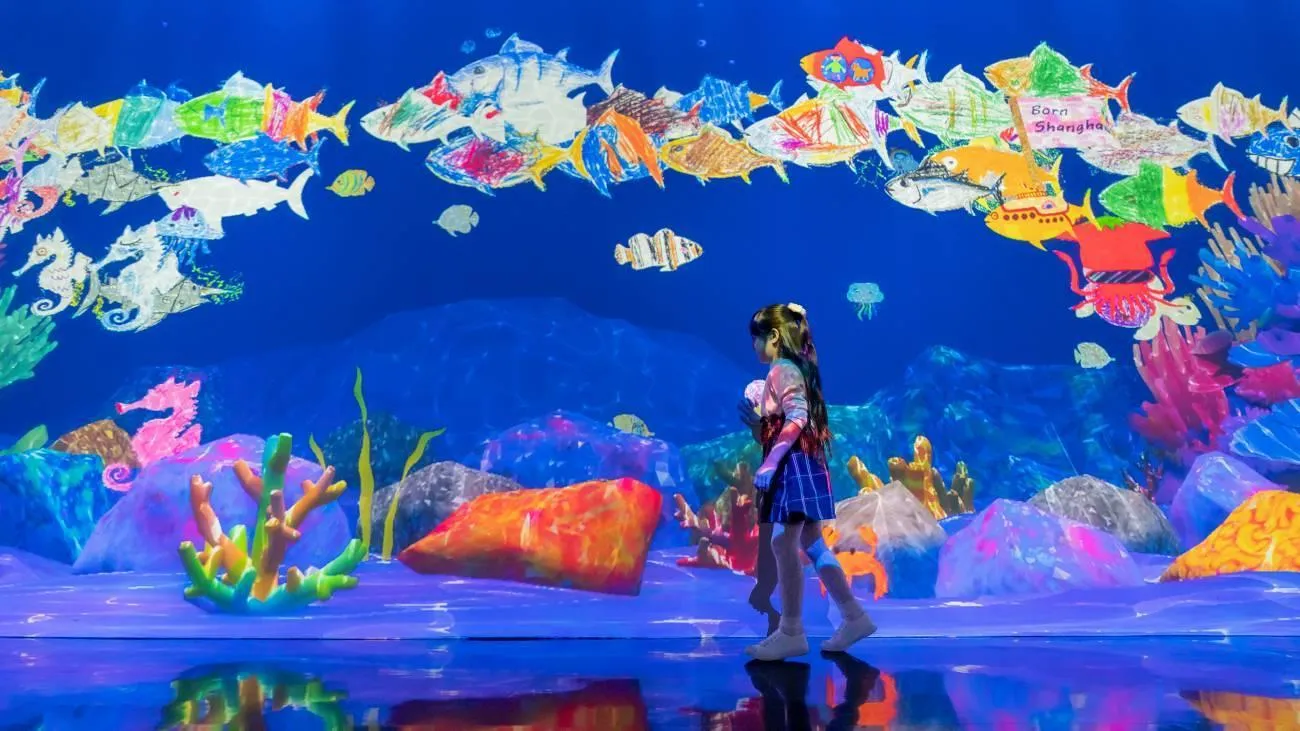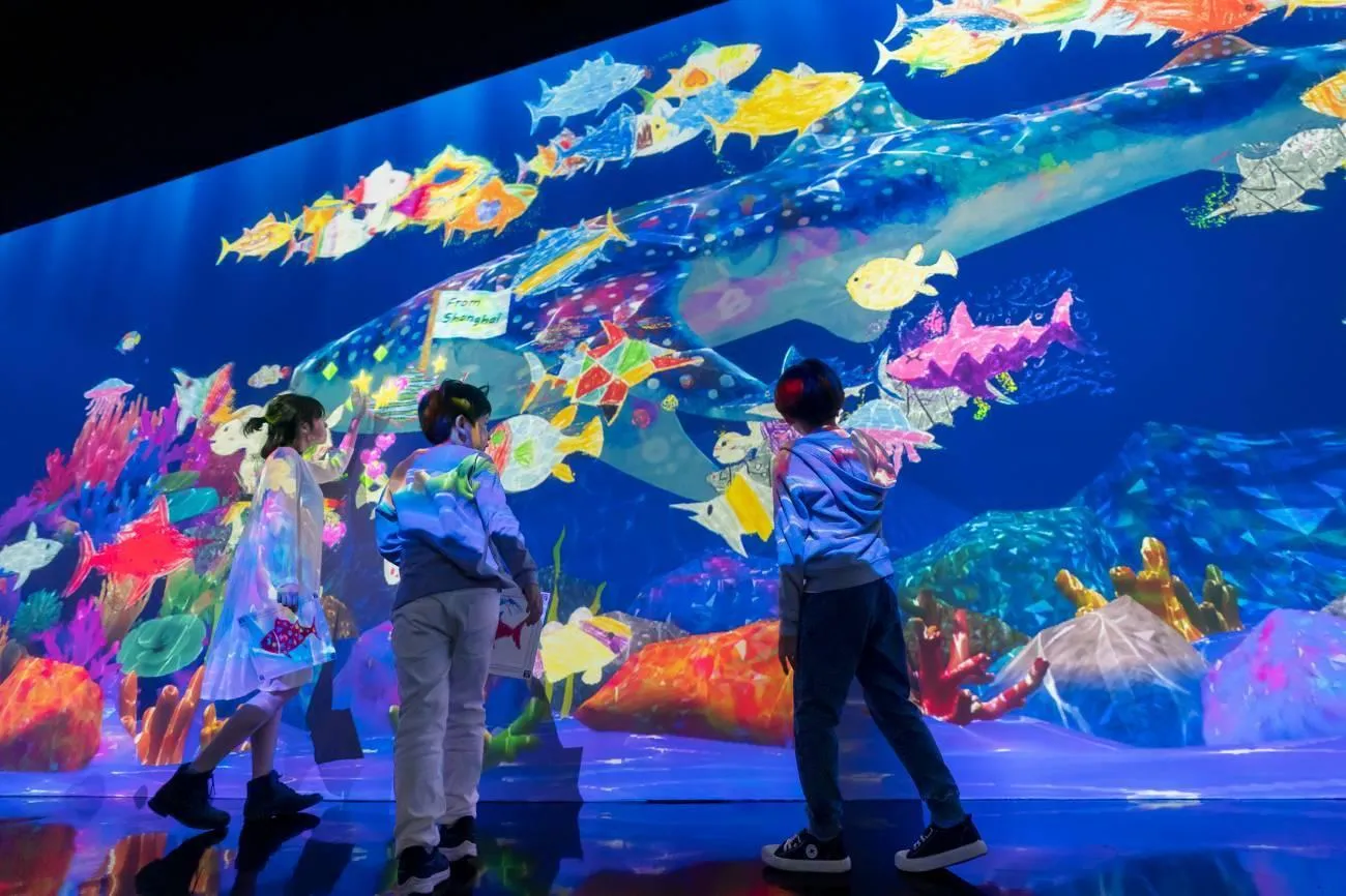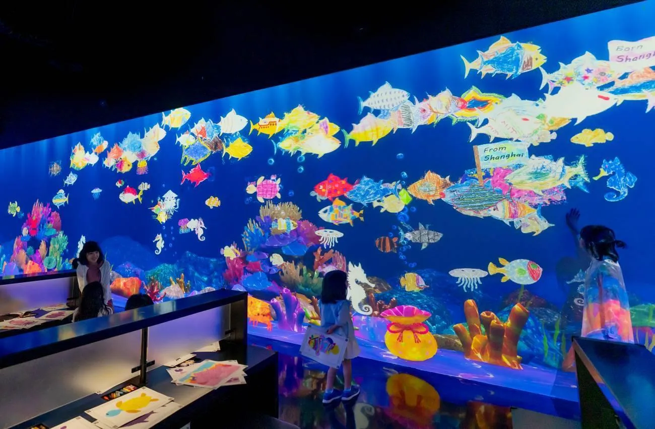 Color in a fish on the paper provided. See the picture you have drawn come to life in the massive aquarium in front of you, swimming together with the fish drawn by other people.