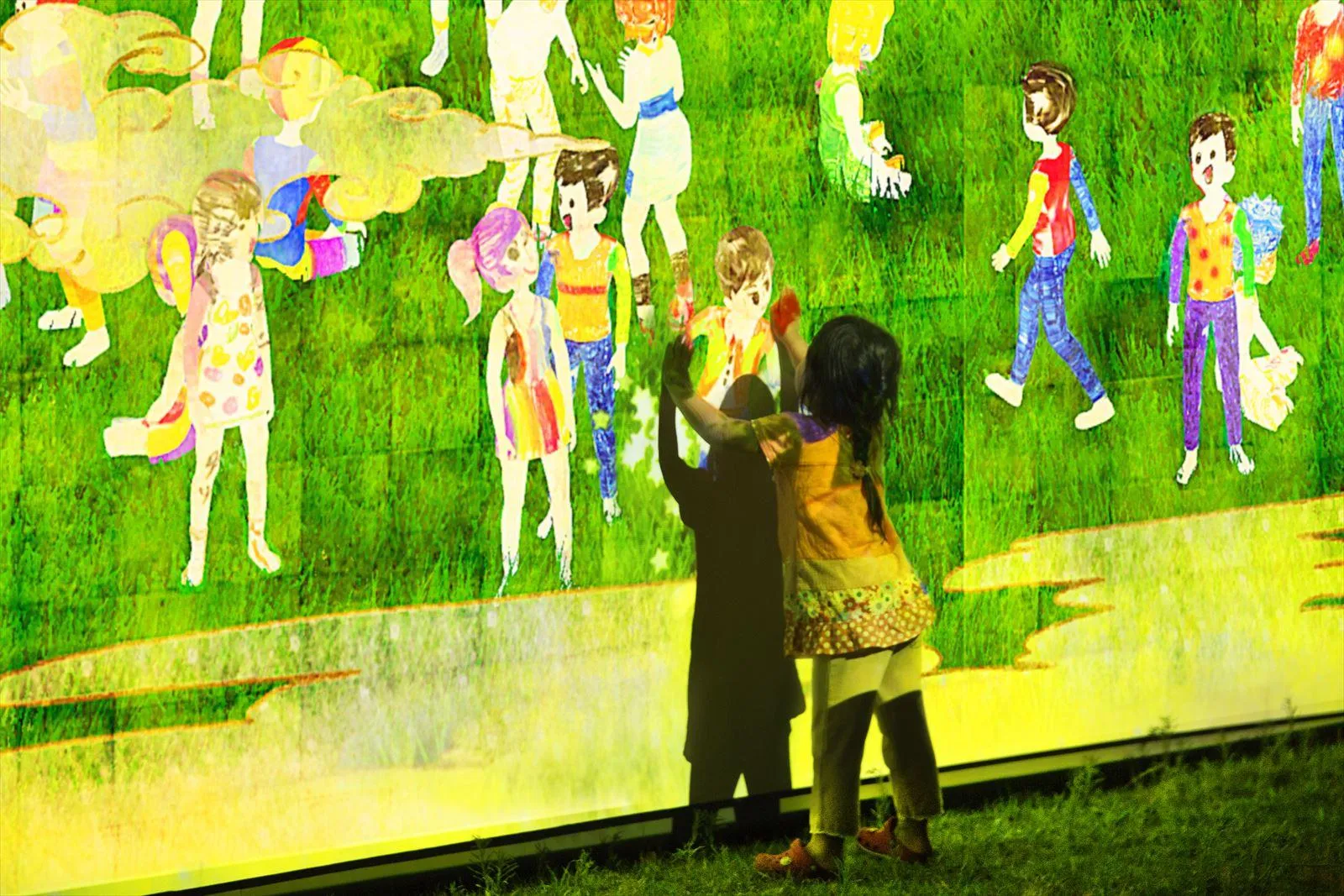 Color images of people and see them move on a large screen in front of you. Gradually, the people begin to form relationships with one another. If you touch them, they become surprised and respond with a variety of actions.