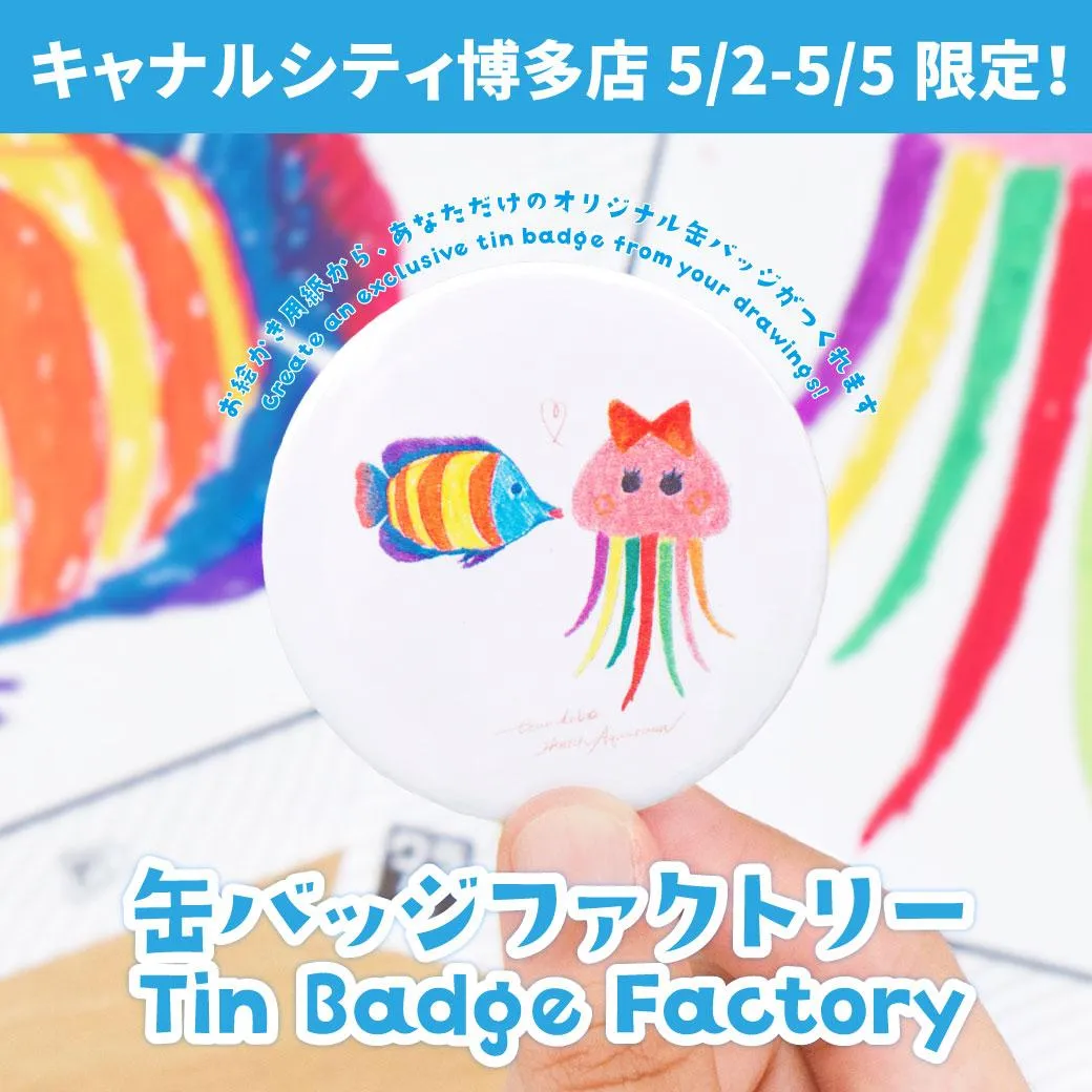 キャナルシティ博多店に缶バッジファクトリーがやってくる!お絵かき水族館・お絵かきタウンで描いた絵を缶バッジにすることができます。家族やお友達でおそろいのものを作ったり、自分だけのオリジナルのものを作っ...
